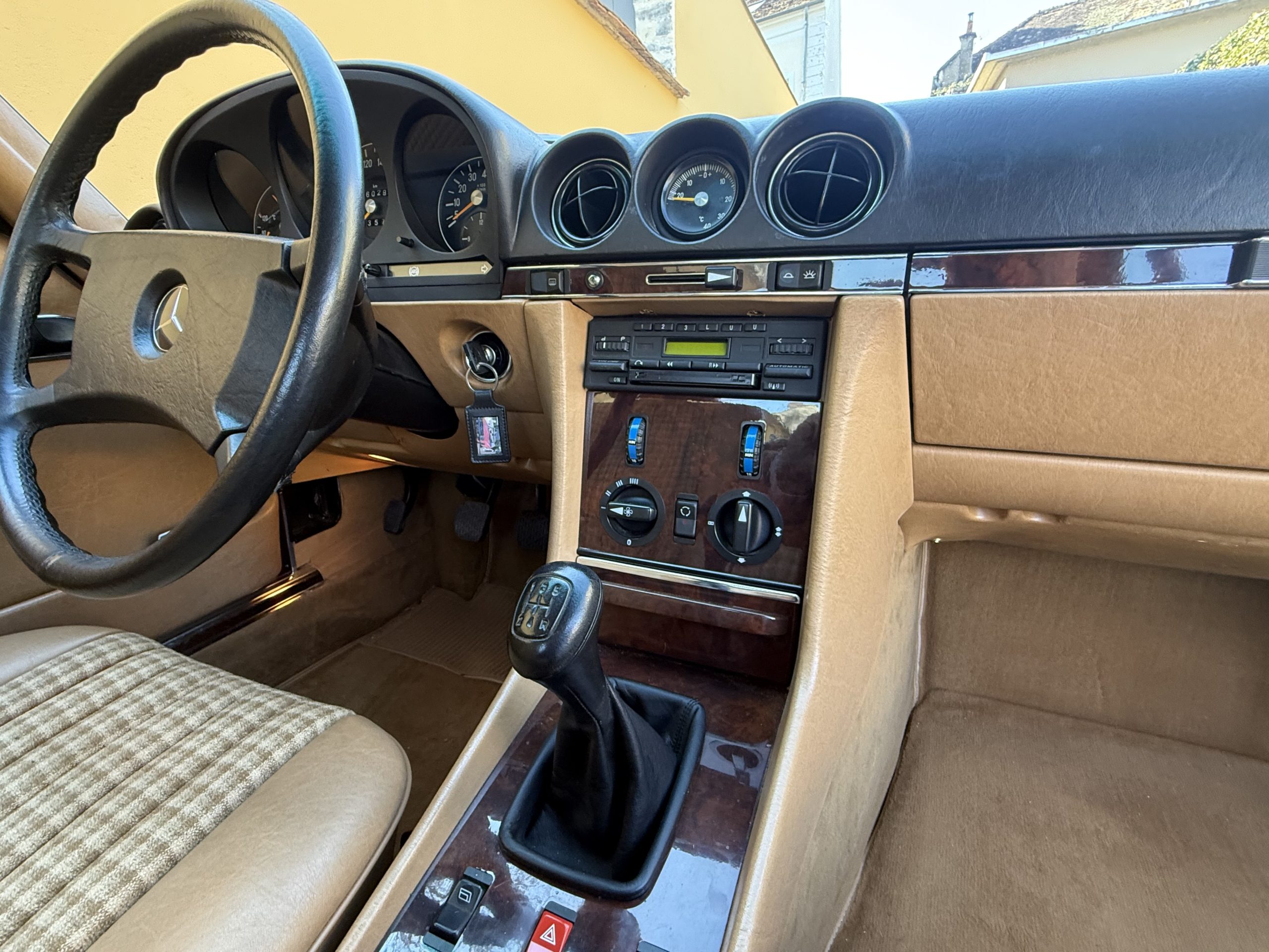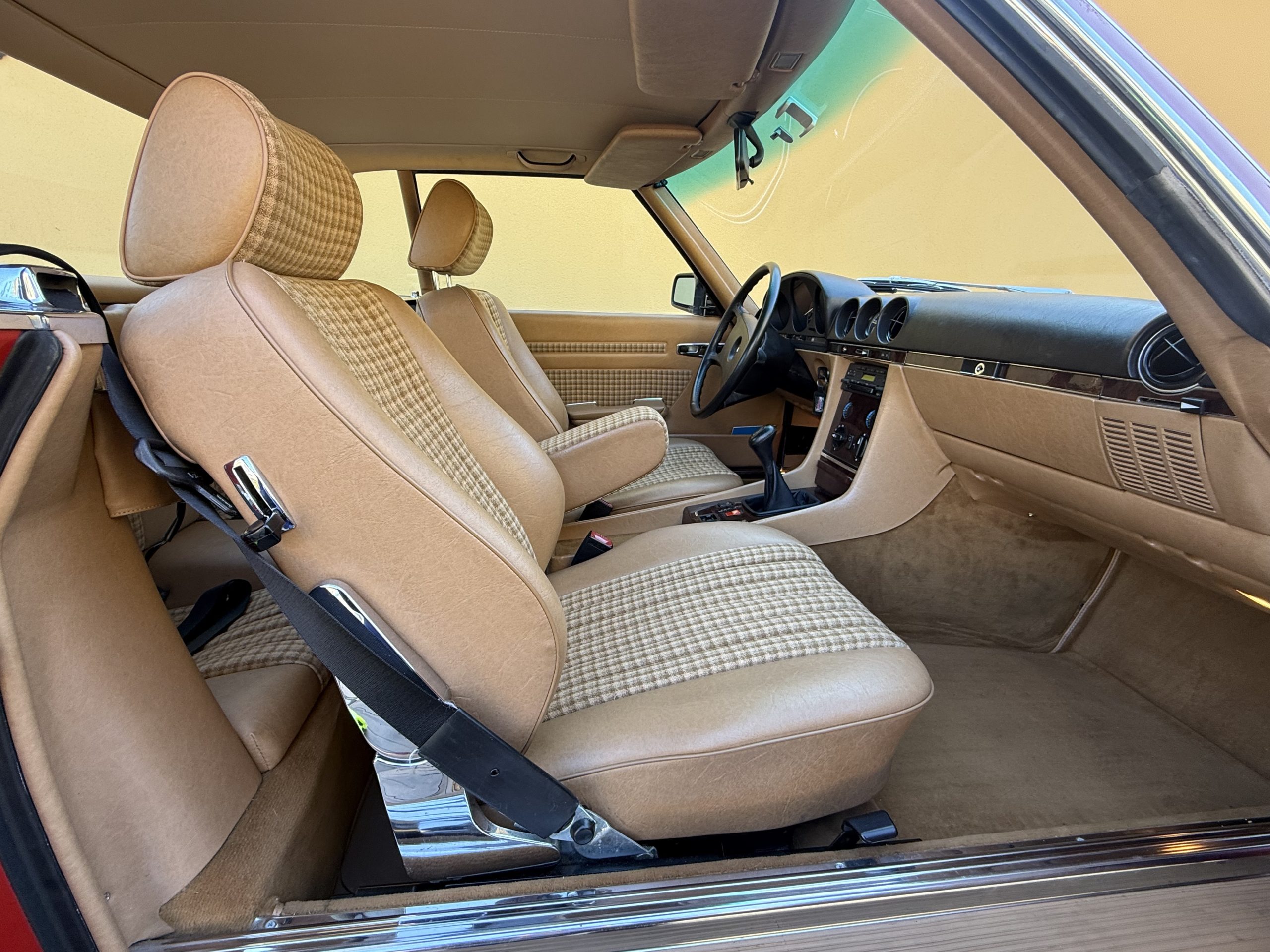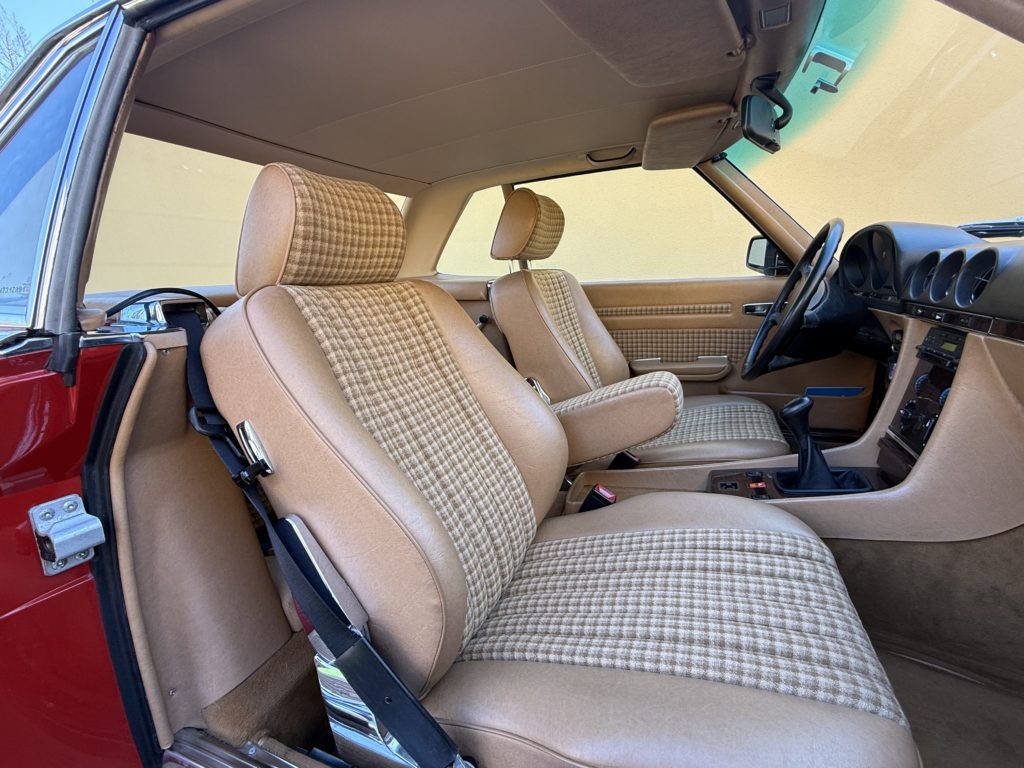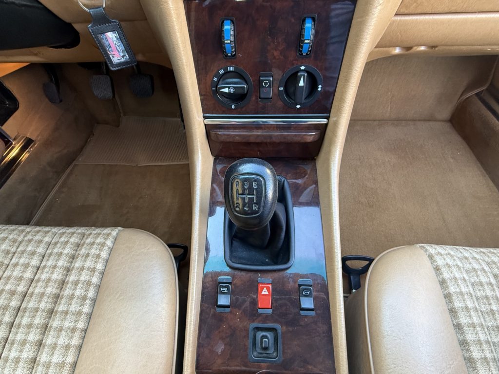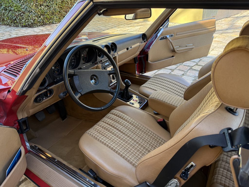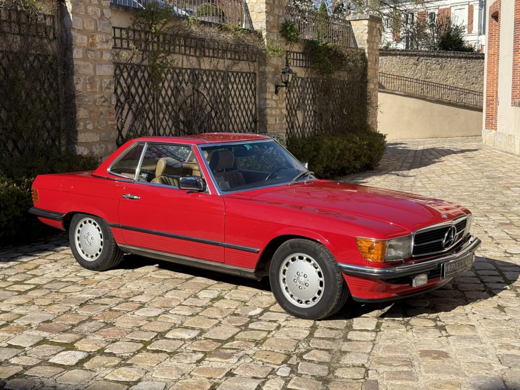 L’exemplaire présenté est une 300 SL livrée neuve à Orleans en avril 1987 comme l’atteste son bon de commande original. J’ai vendu cette voiture il y a 9 ans chez Mercedes G.G.E Classic à 56000 kilomètres. Elle en a aujourd’hui 60000 et se trouve toujours dans le même excellent état. J’ai également récupéré son dossier retraçant sa vie et soulignant le sérieux de l’entretien effectué. L’assortiment de la teinte ‘’rouge signal’’ de la carrosserie et du tissu beige à carreaux lui apporte une note vintage de plus en plus recherchée. Sa boite mécanique à cinq rapports permet d’exploiter pleinement les 188 ch de ses six cylindres en ligne. Outre le système ABS de série, elle est également équipée d’une radio, de lave-phares et de la banquette arrière en option usine.